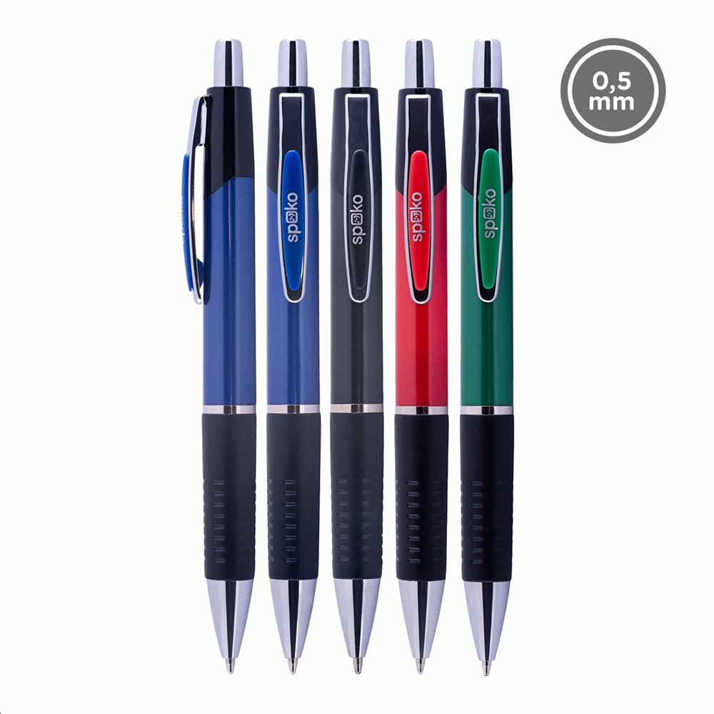 Nyomógombos golyóstoll enyhén metálos csillogású testtel, tartós, fém klipsszel, enyhén bordázott, gumírozott fogórésszel a csúszásmentes fogás és komfortos írás érdekében. Nyomtatott logó a klipszen. Írásvastagság: 0,5 mm. Kiszerelés: 12 db / doboz. Gazdaságos nagytartályos tollbetéttel, kék színben S0294. Katalóguskód: 67159